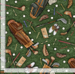 This vibrant fabric features a delightful golf-themed design, showcasing various golfing equipment such as golf bags, clubs, tees, and balls, all set against a lush green background that mimics a golf course. The pattern is playful and detailed, making it perfect for creating unique golf-related apparel, accessories, or home decor items. The fabric's rich color palette and intricate design elements ensure it stands out, appealing to both golf enthusiasts and those looking for a fun, thematic print.